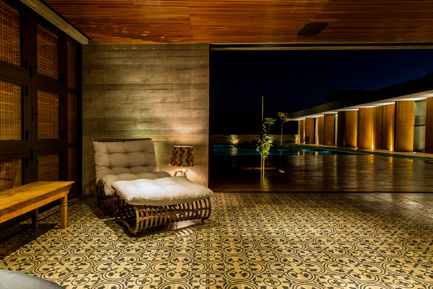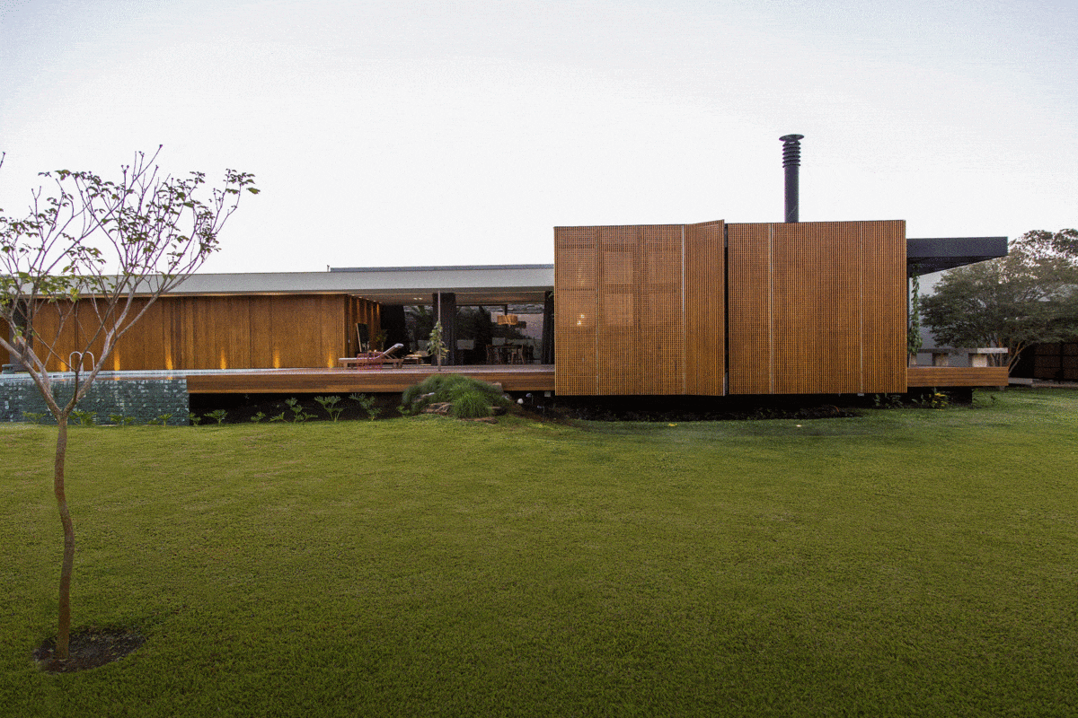 Os materiais usados não apenas determinam o acabamento como também os usos específicos: madeira, concreto, pedra e aço corten expressam a influência do modernismo brasileiro.
